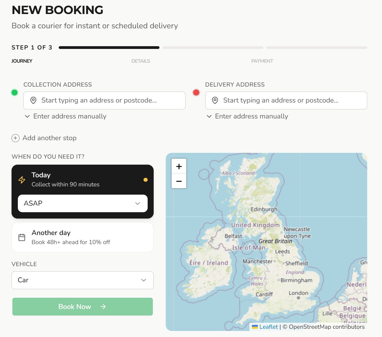How much does it cost to book a same-day courier? It depends on distance and vehicle size. Short urban runs in a car typically start from around £55. Longer routes or larger vehicles cost more. You'll get a fixed price before you pay — no surprises.